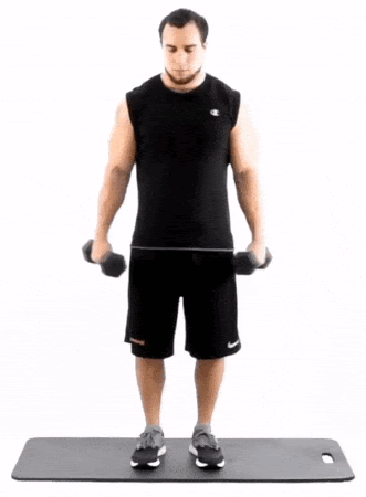 a) Grab a pair of dumbbells with your palms pointing towards the middle of your body.